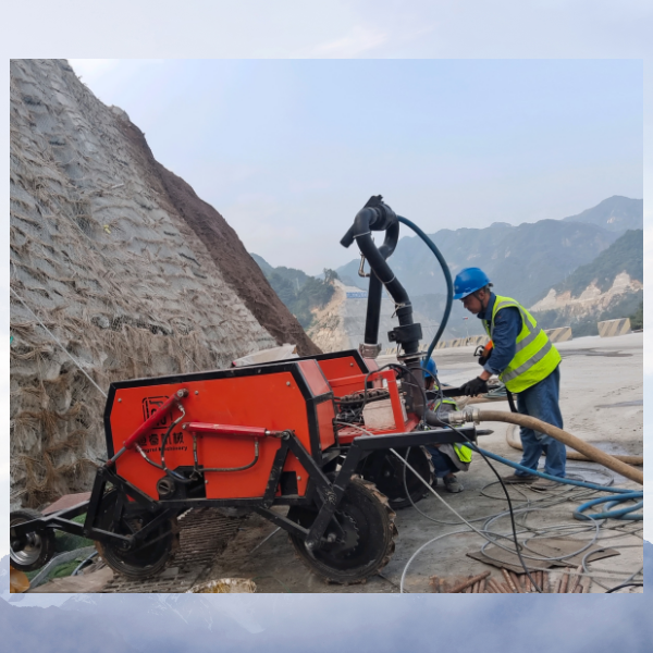 同时,恒睿爬坡钻机还可作为坡面作业平台,在高陡边坡等人工难以到达的坡面,凭借加装不同夹具,实现坡面引管喷播,促成植被生长,以及进行坡面物料运输和平地物料运输,大大抬升了坡面施工效率。