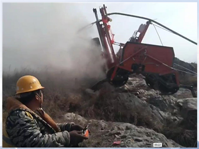 恒睿遥控爬坡钻机采用四轮驱动牵引设计,爬坡能力和越障能力尤为突出,坡面移动速度可达 15 米 / 分钟,在凹凸不平的山坡上也能灵活穿梭,无需起吊设备辅助移动,大大减少了设备调度时间。其凿岩钻孔速度达 1 米 / 分钟,搭配高效动力系统,显著提升了施工进度。更重要的是,整机支持全遥控操作,从爬坡、俯仰到打钻,单人即可完成全部流程,无需搭设脚手架,既降低了人工成本,又避免了施工人员在陡坡作业的安全风险。