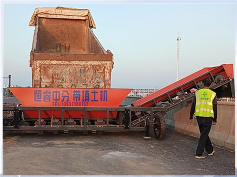 恒睿中分带填土机具备与土方车同步行走布料的核心功能,这一设计打破了传统人工填土与土方车配合脱节的问题。在作业过程中,土方车运输物料时,恒睿中分带填土机可实时跟随,实现物料的即时输送与填土操作,无需人工反复转运物料,大幅减少中间环节的时间浪费。同时,设备采用侧向输料设计,能有效避免物料落地污染路面,既省去了后续路面清理的工作量,又符合绿色施工理念,让施工过程更环保、作业节奏更紧凑。