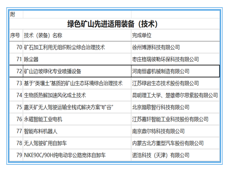 2022年8月9日,中关村绿色矿山产业联盟(下称中绿盟)在北京组织召开第三批科学技术成果评价会议,会议以线上与线下相结合的形式举行。恒睿机械作为喷播设备代表厂家入选中绿盟“百项装备进万家矿山”评选活动。评审专家对部分科学技术成果的创新点、应用效果予以肯定与表扬,也对部分项目工艺、技术提出了宝贵的建议。