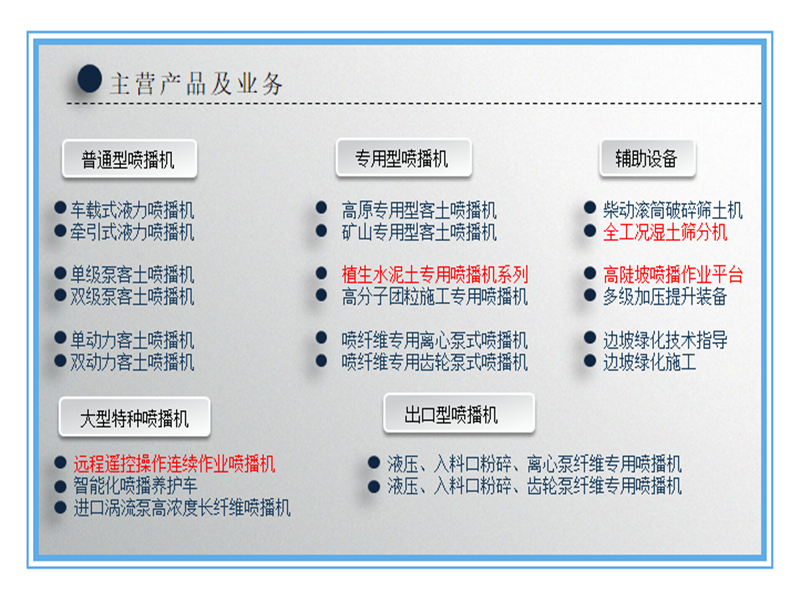恒睿机械生产的喷播设备囊括了矿山修复、高速公路边坡绿化、风电场复绿喷播所需的全部喷播绿化设备。其中智能型多功能喷播机是恒睿机械与北京林业大学共同合作并已经过实验性测试,它不仅可以远程遥控操作而且智能化程度也很高。