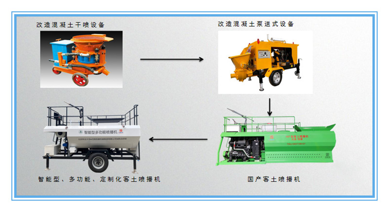 由最开始的改造混凝土干喷设备到混凝土泵送式设备,再到国产客土喷播机的诞生,最终研发出智能型、多功能、定制化的客土喷播机。这正是经过一代代不懈自我研发的精神和团队协作共赢的结果。